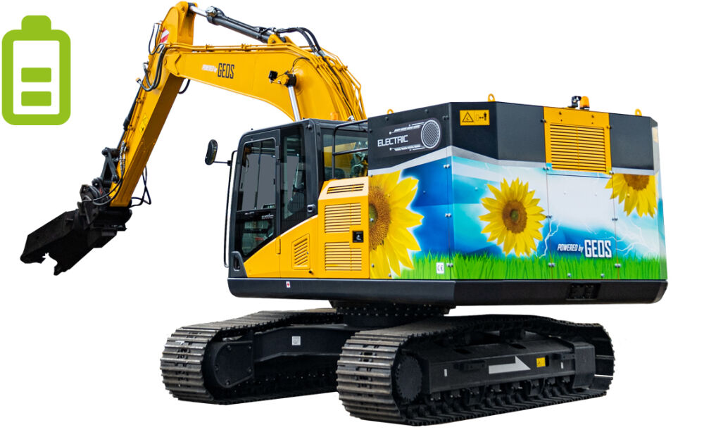 Het GEOS mobiele accupakket rijdt naar de elektrische machines toe om deze op te laden. Hierdoor blijft het accupercentage van de machines bespaard. Doordat de batterij op een rupsdumper is gebouwd, kunt u emissievrij werken op iedere locatie.